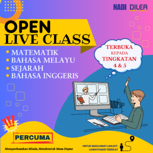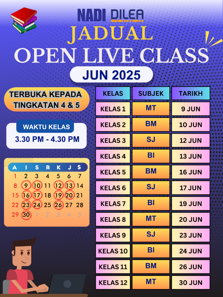 Bermula Jun 2025, DILEA akan mengadakan sesi OPEN LIVE CLASS yang terbuka kepada semua pelajar Tingkatan 4 dan 5. Kelas ini akan berlangsung setiap hari dari jam 3:30 hingga 4:30 petang, kecuali pada hari Rabu dan cuti umum.